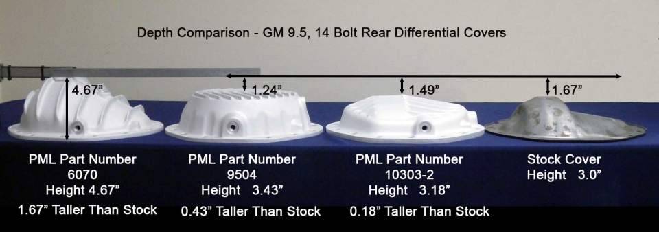 PML makes two covers for the GM 9.5 inch ring gear differential. Both fit the differential. This cover was designed to provide maximum capacity without interfering with the spare tire. The other cover is PML part number 10303-2.