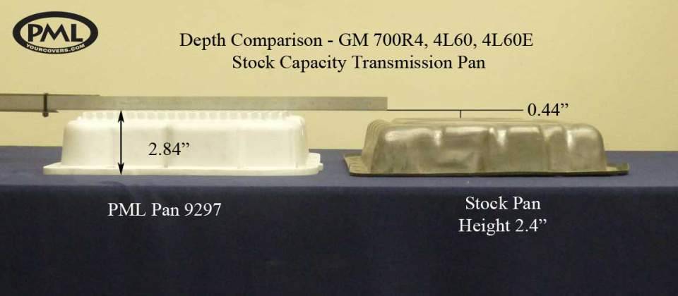 Note there are two versions of the stock GM shallow pan. They have the same depth. The older version is primarily found on 700R4 transmissions. This PML pan can replace either style GM shallow pan.