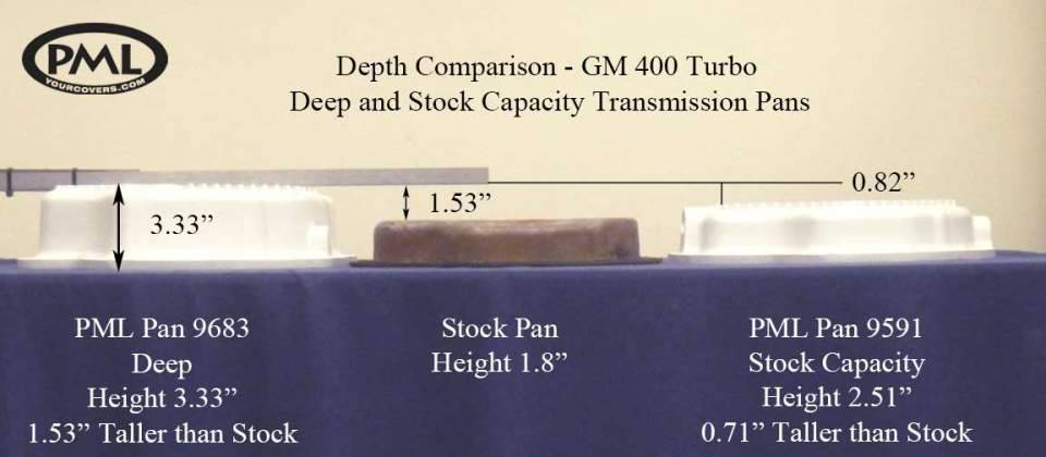 The PML deep transmission pan fits many cars and trucks with the GM TH 400 transmission. This transmission is found in GMC and Chevy vehicles. For example: