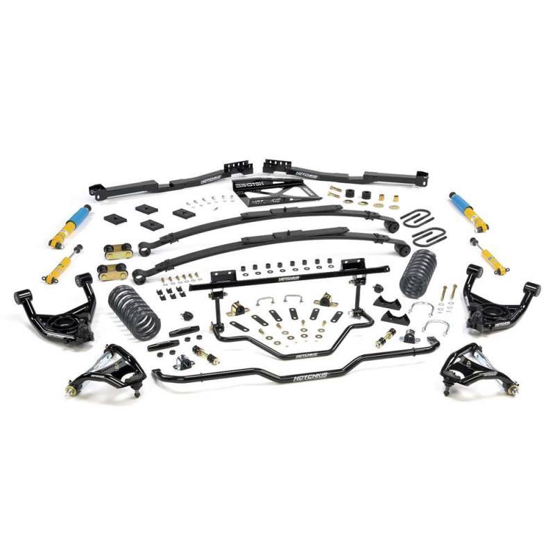 Hotchkis Sport Suspension 80014-2CV Stage 2 TVS Kit Extreme with 2 in. drop for 1967-1969 Camaro and Firebird Convertibles with Big Block motors. Includes Adjustable Rear Sway Bars 1 1/8 in. Front and 7/8 in. in rear with Chassis Max Sway Bar Brace 2 in. Lowered Sport Springs 1.5 in. Lowered Leaf Springs (3 Inch Kit Also Available) and Front and Rear Hotchkis Tuned/Bilstein Shocks Sub Frame Connectors (Chassis Max Brace Also Included on Convertible Kits) all necessary Hardware and Bushings with Heavy Duty Tie Rod Sleeves also included. One Convenient Kit for the ultimate handling GM F-Body Camaro or Firebird nothing beats the Hotchkis Sport Suspension Stage 2 Total Vehicle System. This kit has been rigorously designed and tested on the track yet is very comfortable for your local cruise in. Every aspect of the suspension has been re engineered for the maximum performance and is being offered in a complete tuned package. In front we start out with Tubular Upper and Lower Control Arms which increase caster and improves the camber curve creating more front end grip and traction. Heavy duty tie rod sleeves hold the alignment while 2 in. (3 in. also available) lowered sport springs and Hotchkis Tuned/Bilstein shocks improve vehicle control and stance. A massive 1 1/8 in. front sway bar and 7/8 in. adjustable rear sway bar reduce body roll and improve handling. To improve traction and reduce wheel hop the rear gets a 1.5 in. (3 in. also available) multi leaf drop spring which features a Hotchkis exclusive design that utilizes an overload spring to reduce axle wrap up. The kit comes complete with heavy duty shackles u-bolts pads and all necessary hardware. To stiffen the chassis Hotchkis includes sub frame connectors and a rear sway bar cross member creating a complete package. This system is a proven autocross winner and designed for maximum performance improvement in a installer friendly kit. PROUDLY MADE IN THE USA