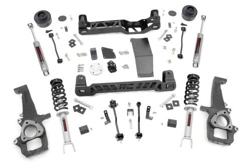 Give your RAM 1500 the perfect blend of performance, protection, and style with Rough Country's 4-inch Suspension Lift. Designed to offer an affordable way to maximize off-road performance and run up to 35-inch tires, these kits offer high quality, heavy-duty equipment for new model RAM 1500’s. Utilizing heavy-duty, laser cut, steel equipment engineered by Rough Country, these 4-inch Suspension Lifts are complete kits that include everything needed for outstanding off-road performance. High-clearance front and rear cross-members provide enough room for off-road climbs and runs. A heavy-duty skid plate shields the vehicle’s differential, protecting you from hazardous terrain. A durable set of driver and passenger side lifted cast knuckles are also included, helping to promote proper geometry once the vehicle is lifted. For true trailblazers, this kit also ships with a set of rear N3 Nitrogen-charged shock absorbers - valved specifically for a blend of on and off-road performance. Includes Rough Country's Lifetime Replacement Guarantee!