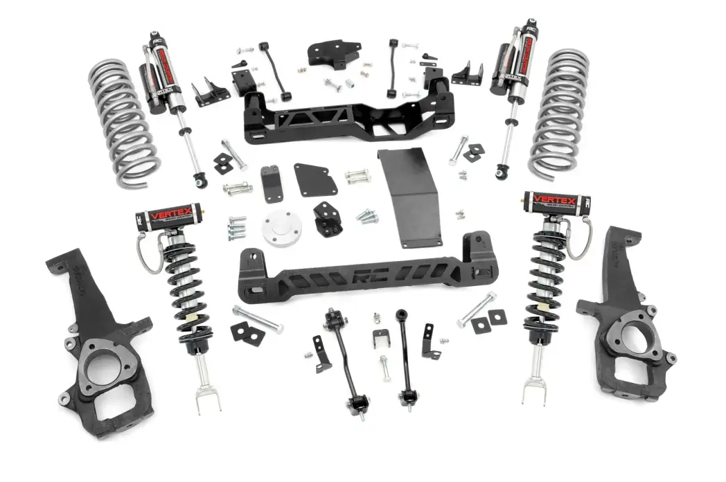 Utilizing heavy-duty, laser cut, steel equipment engineered by Rough Country, these 6-inch Suspension Lifts are complete kits that include everything needed for outstanding off-road performance. High-clearance front and rear cross-members provide enough room for off-road climbs and runs. A heavy-duty skid plate shields the vehicle’s differential, protecting you from hazardous terrain. A durable set of driver and passenger side lifted cast knuckles are also included, helping to promote proper geometry once the vehicle is lifted. And for true trailblazers, this kit also ships with a set of rear N3 shock absorbers - Rough Country’s premiere shocks; valved specifically for unparalleled off-road performance.
