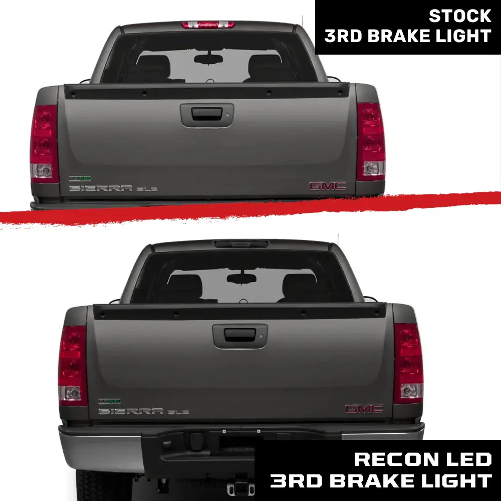 Designed for the 2007-13 GMC Sierra & Chevy Silverado 1500/2500/3500. This Scanning LED smoked third red brake light kit from RECON comes complete with white CREE XML LED cargo lights. It's the perfect GMC or Chevy truck upgrade. As one of our most popular third brake light upgrades we know this product is just what every GMC or Chevy truck owner needs, too. It's the best smoked third brake light there is. It's simple, yet powerful. That's why we made this smoked third brake light.