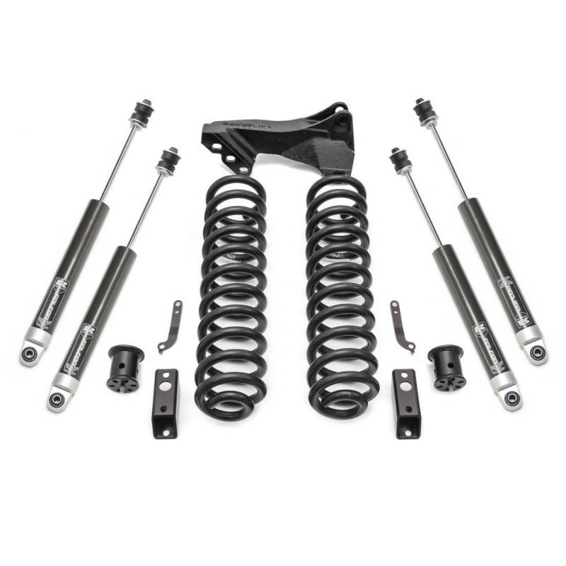 The ReadyLIFT 2.5" Coil Spring Front leveling kit system for 2011-2016 Ford Super Duty F250 and F350 trucks also included model-specific brake line extension brackets, Our time-tested bump stop extension brackets and new front sway bar frame mount extension brackets to keep the factory sway bar where is supposed to be. If you want tough looks and a smooth but controlled ride, then you want the new 46-27290 Coil Spring Leveling Kit System. Your truck will thank you!