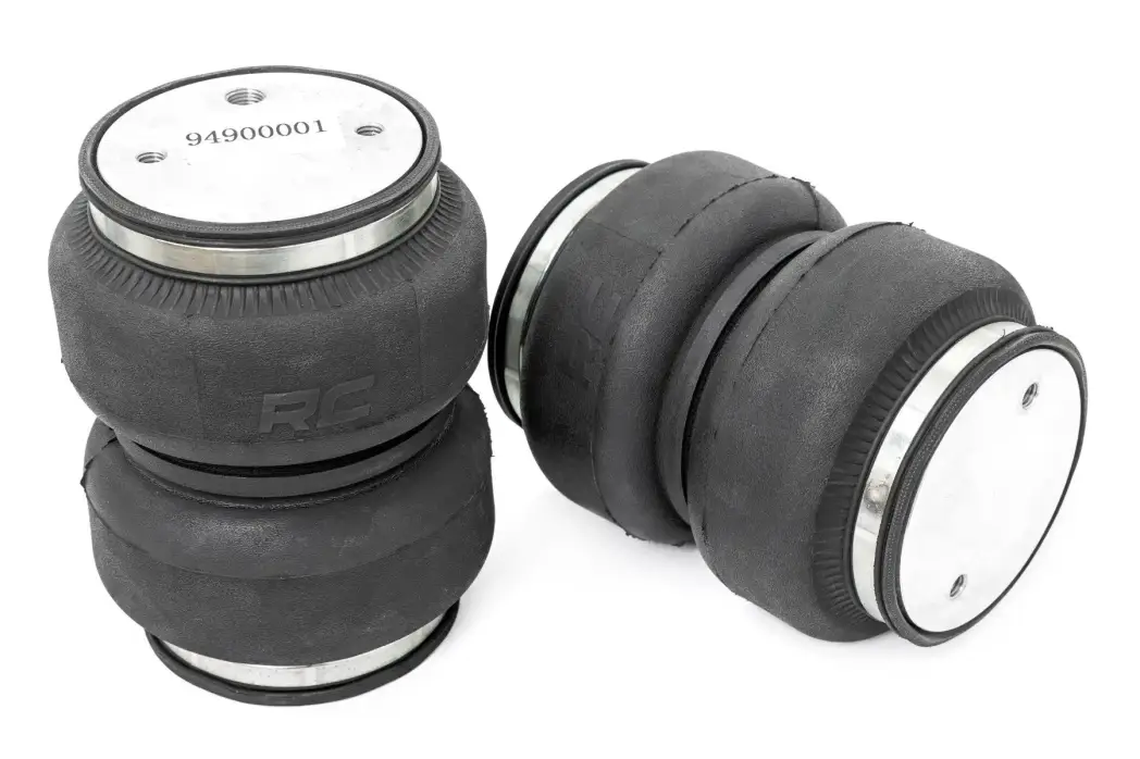 Heavy-duty Construction. Rough Country's Rear Air Spring Kit features two RC branded high-quality double convoluted airbags complemented with DOT-approved airlines. Whether you plan on towing or hauling in the not-so-distant future Rough Country's Air Spring kit is the must-have accessory to ensure that your trailer is level reducing the weight off of the tongue of your trailer. Each kit offers 1/4" push connector fittings and all of the bracketry needed to ensure installation is lightning fast and secure! Rough Country's Air Spring kit provides up to 5,000 lbs of load support to ensure that you experience less sway and bottoming out when braking and steering!
