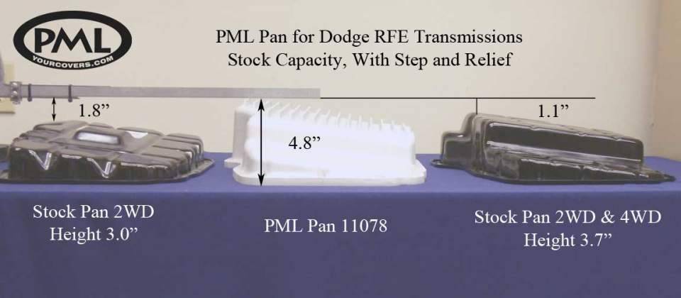 PML makes four pans for the 68RFE, 45RFE, 5-45RFE, 65RFE, 66RFE, 68RFE transmissions. All fit the transmissions. The different designs suit a variety of vehicles and applications.