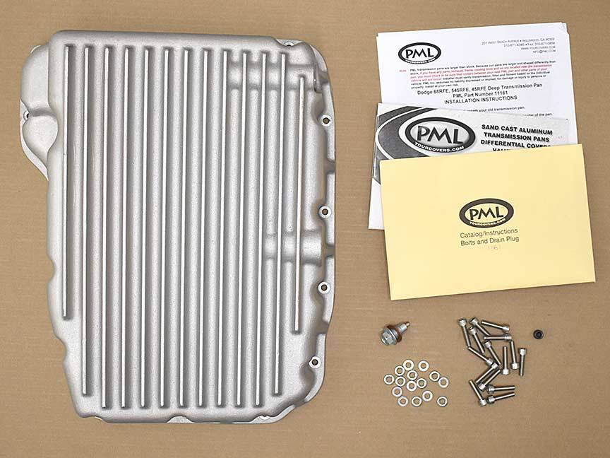 PML designed this deep transmission oil pan to replace the stock pan on many configurations of these vehicles with a Chrysler Dodge 45RFE, 545RFE, 65RFE, 66RFE, and 68RFE:
