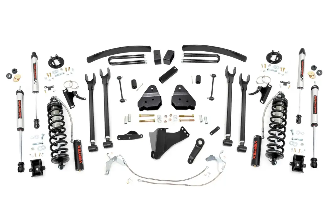 Give your second-generation Ford Super Duty an impressive upgrade and incredible ride quality with Rough Country’s 4-Link Coilover Conversion Lift Kit! This must-have kit is the pinnacle of suspension upgrades. Providing ride height adjustability, increased dampening, and killer good looks. You're sure to set yourself apart from the pack. This innovative kit allows you to replace your factory arms with a 4-Link setup, using Rough Country’s durable, fixed upper arms and adjustable lower control arms. A set of radius arm drop brackets maintain proper geometry and allow for proper caster setting, which is crucial to maintaining factory handling.