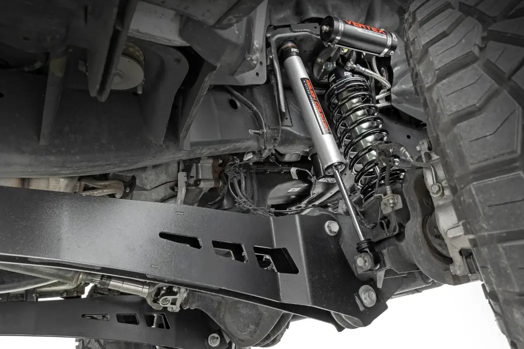 Durable Components. Rough Country’s 5" Coilover Conversion Kit features top-mounted reservoir brackets and coil-over mounts constructed from 1/4-inch steel. Utilizing this conversion kit you're removing the factory independent coil shock and coil set-up and replacing it with a massive 2.5in piston, nitrogen-charged, 8-stage adjustable Vertex Coilover. Rough Country’s Vertex Coilovers feature a monotube design with an external reservoir for increased oil capacity and damping sensitivity. When it comes to investing in a high-end kit, you’ll be pleased to find that Rough Country’s 2.5in piston design is beefier and offers an impressive 56% greater fluid capacity than the average reservoir shock. Each kit is paired with a V2 monotube shock that provides optimal damping control.