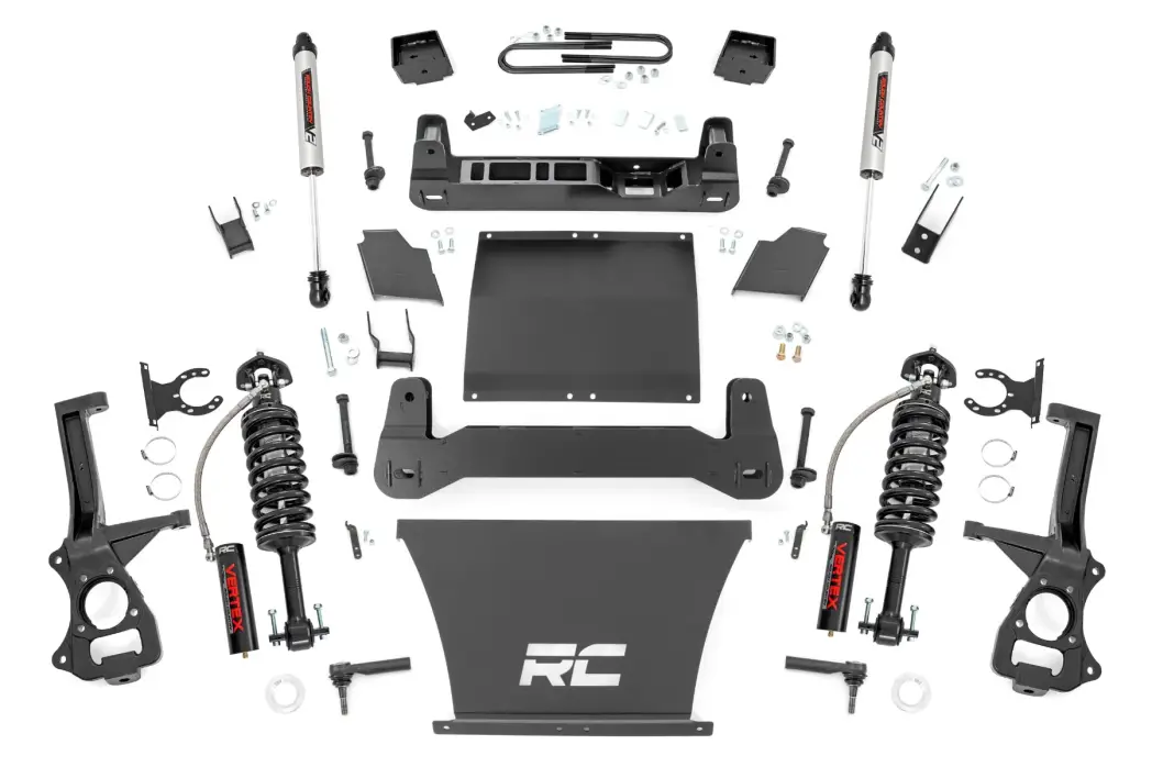 Innovative Design and Construction. When changing a vehicle's suspension, the key to preserving ride quality is keeping the geometry of all suspension components as close to their factory angles as possible. This suspension kit combines the use of durable steel knuckles, differential brackets, and drop cross members to reduce cv angles and simulate factory angles all while achieving new heights. Featuring a set of upper strut spacers that offer uncompromised strength and rigidity, gaining lift height is no issue. Completing the rear of this suspension kit is a set of rear blocks, shocks, and u-bolts that allow you to retain factory-like geometry. This combined setup provides enough clearance to run 35" tires without additional modifications. We didn't want to limit you to one standard kit. Rough Country's 6-inch kit is configurable with all the shock options that we offer. This allows you to choose which shock series you want! Ranging from our nitrogen-charged N3 shocks to our Vertex reservoir shocks the power to choose is in your hands.