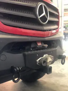 Venture onto dirt roads knowing you have a back up plan if you get stuck or a trail obstacle ahead of you is just a bit beyond your van's capability. Our winch mounting system completely replaces the factory bumper under the plastic cover. We include two front 3/4" thick recovery points and a 2" front receiver hitch attachment. You can choose to run all three of the bolt on accessories or any combination. The optional hitch is great for bicycle racks, as a recovery point and campground utility. Constructed from 3/16" steel plate and 1/4" square tube. Powder coated black with a zinc primer for maximum corrosion resistance. This front winch mount is designed around the Warn Zeon series of winches. Many other winches are compatible with this kit, but please reference the Warn Zeon 12 winch for the maximum winch size. The front hitch should only be used on vans without collision assist / brake sensors, as carrying gear can cause sensor warnings.