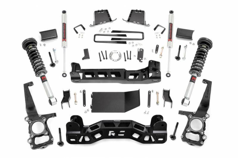 Give your Ford F-150 an aggressive new look and unparalleled off-road performance with Rough Country's 6-inch Suspension Lift. This all-inclusive kit features everything needed to take your Ford off the freeway and into the fields. Featuring a set of durable lifted knuckles and strut spacers or N3 lifted struts, you'll gain enough ride height to run up to 35-inch tires! A set of differential drop brackets, sway-bar drop brackets, brake line brackets, and a drive shaft spacer help keep everything at an optimum angle for a factory-like ride, even after lifting.