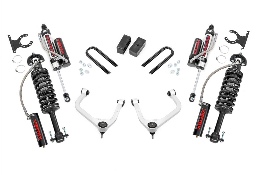 28850 | Rough Country 3.5 Inch Lift Kit GMC Sierra 1500 2WD/4WD | Aluminum Finish Arms, Factory Rear Mono Leaf Spring, Vertex Coilovers With Vertex Rear Shocks