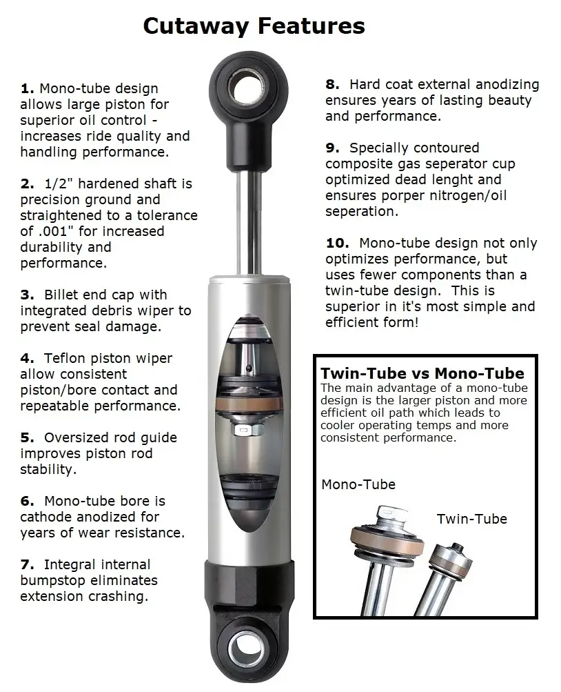 Shock absorbers are without a doubt the brains of your suspension. Nothing influences how your car rides and handles more than its shock absorbers. Their primary function is to control the oscillations of your car’s springs thereby keeping your tires in contact with the road. To best accomplish that objective, RideTech shock absorbers utilize monotube design which allows for a larger piston and more precise valving. The design is superior to twin tubes shocks with respect to damping and reliability. These HQ Series Shocks are rebound adjustable shock absorbers and offer exceptional quality thanks to impact-forged, hard-anodized bodies and heavy-duty shafts. They carry an industry-best 1,000,001 mile warranty.