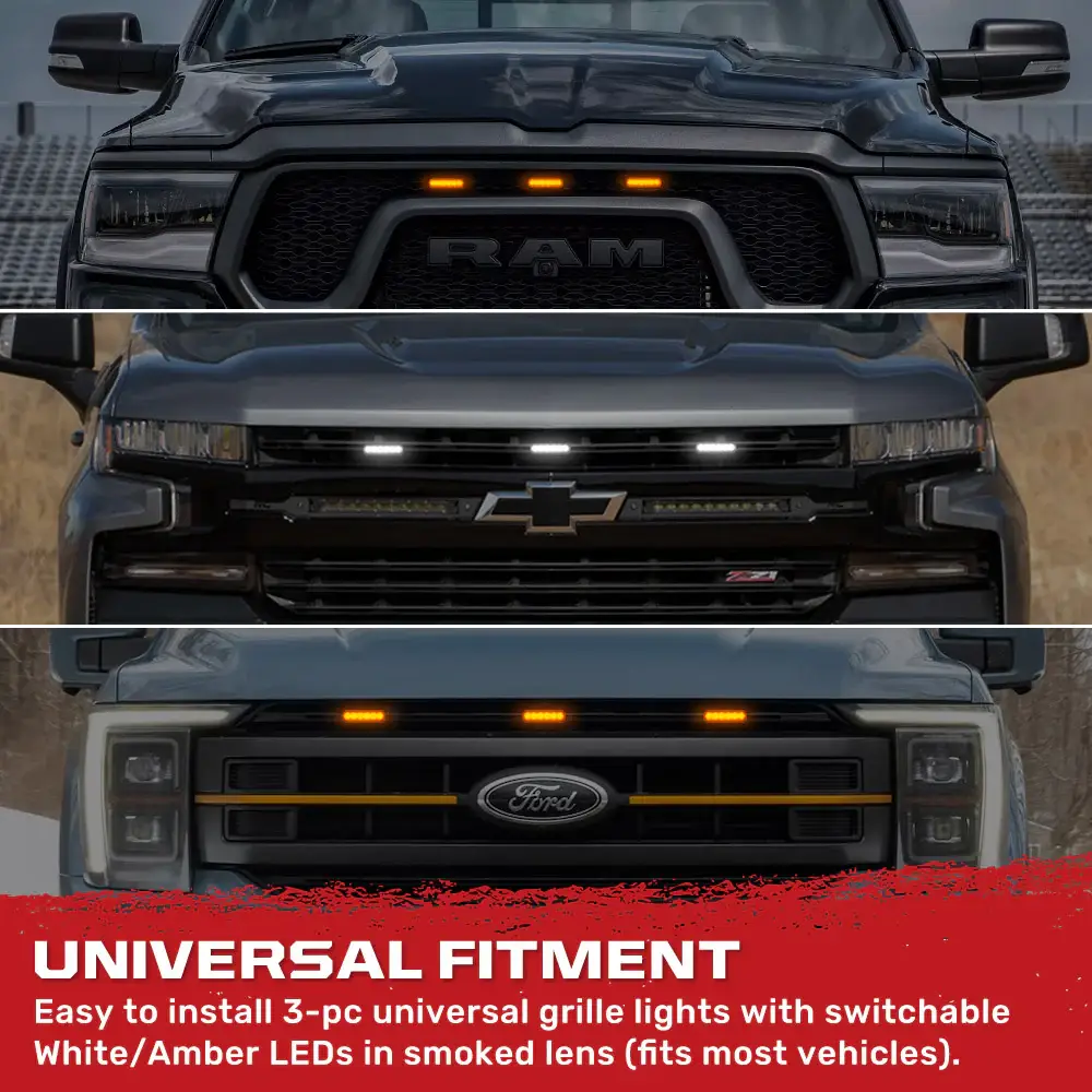Universal 3-Pc Front Grille High Power Switchable Amber or White LED Running Lights - Smoked Lens