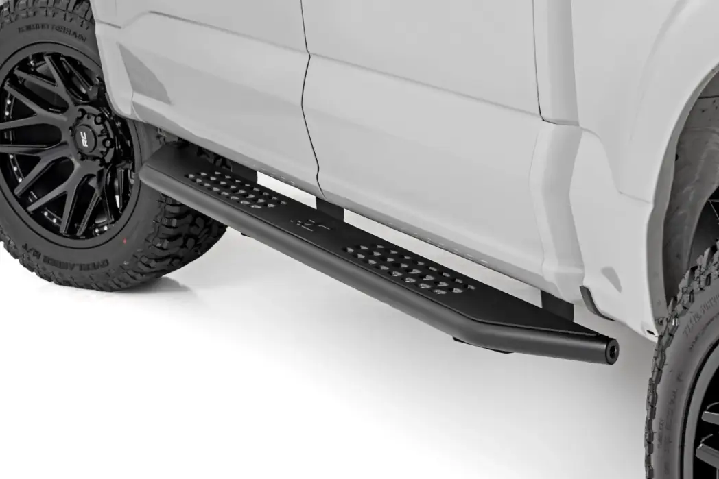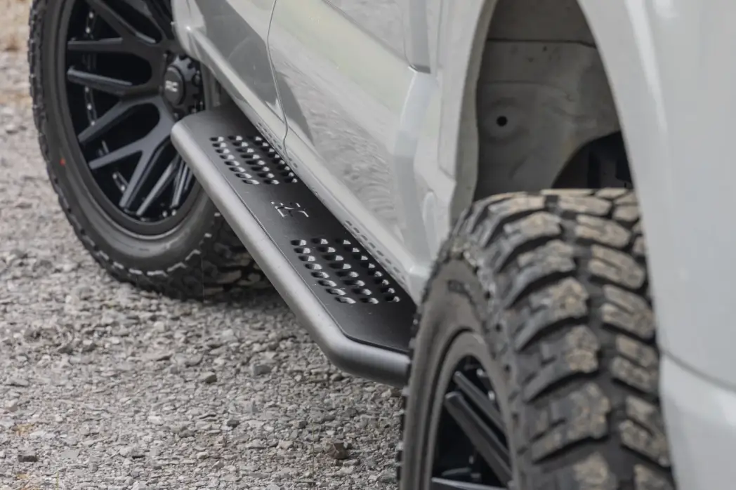 Rugged Durability: Made from durable steel and wrapped with a tubular side wall, the OV2 Running Boards offer reliable protection against rocks and debris the trail throws your way. The 1 ¾ inch steel tubing provides added body protection, ensuring your F-150 stays in top condition no matter where you go.