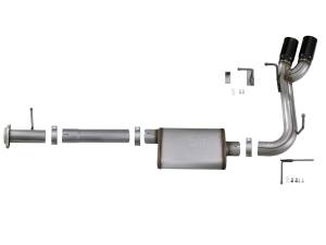 aFe power introduces the all new Rebel Series dual middle-side exit exhaust system. This Rebel Series cat-back is designed with dual black exhaust tips that exit in front of the rear passenger tire for a unique, aggressive look. The tips come with a unique aFe Power logos laser-etched on the side and constructed from stainless steel for durability. The exhaust system is constructed from 3" MIG-welded, mandrel bent stainless steel tubing for maximum flow, increased horsepower and torque. In testing, this cat-back exhaust system added an astounding +9 horsepower and +10 lbs. x ft. of torque as verified by our in house dyno. This kit uses an 18" free-flowing muffler to absorb high pitch tones producing a powerful sound, virtually eliminating drone. The performance cat-back exhaust system includes all necessary hardware and clamps for a hassle-free install, with no cutting required making it a true bolt on system.