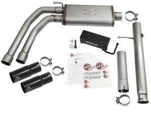 Finishing off the exhaust are dual 3-1/2" black stainless steel clamp-on tips with laser-etched aFe POWER logos on the side for an aggressive style. The tips are designed to exit from in front of the rear passenger side tire for a unique custom look.