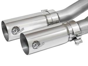 Finishing off the exhaust are dual 3-1/2" diameter polished 304 stainless steel clamp-on tips with a laser-etched aFe POWER logo on the side for an aggressive style. The tips are designed to exit from in front of the rear passenger side tire for a unique custom look.