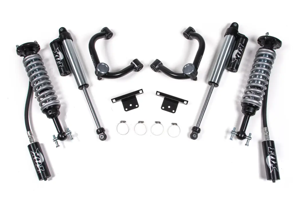 Up front the lift kit includes FOX 2.5 Factory Series remote reservoir coil-over shocks and heavy duty tubular upper control arms for increased strength. In the rear this kit utilizes a complementary set of FOX 2.0 Performance shocks for the smoothest ride.