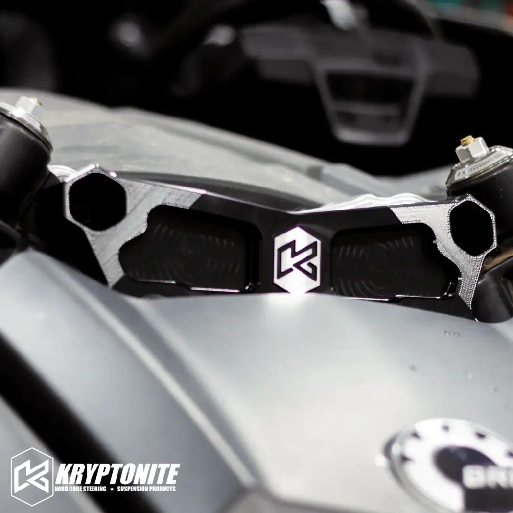 Kryptonite Steering and Suspension introduces our new Full Death Grip Front Shock Tower Brace Kit for the Can-Am Maverick X3. With a solid reputation the Duramax Diesel market, you can now trust our Kryptonite Products on your UTV. Our Shock Tower Braces are made from high strength 6061 T6 aircraft-grade aluminum and are designed and built in the USA. This Shock Tower Brace will completely eliminate factory weak points and give you a solid and reliable steering system. This direct bolt on Brace comes in a hard anodized matte black finish with the Kryptonite logo engraved.