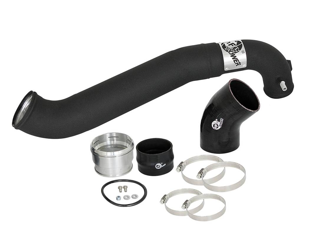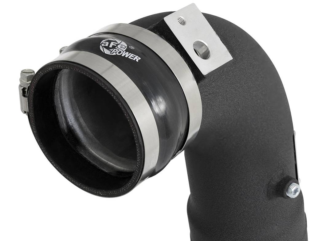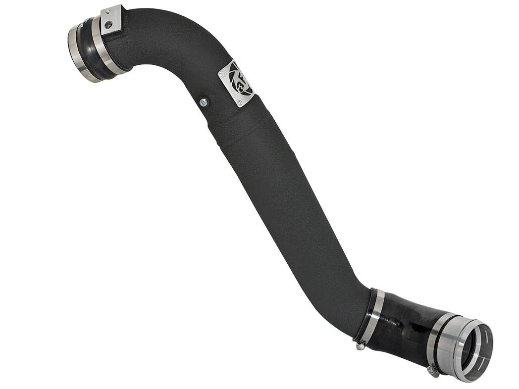 aFe POWER's cold side intercooler tube is constructed from 3-1/2" and 3" mandrel-bent aluminum for maximum flow, then powder-coated for a an aggressive black finish. The high-temp powder-coating insulates the tube from engine heat and protects from corrosion. Its smooth transition bends decrease turbulence and minimize pressure loss, while increasing horsepower and torque. This tube is also equipped with a billet aluminum factory style quick connect adapter that seals with an o-ring. One 1/8" NPT port is provided on the tube for a sensor or water-methanol injection.