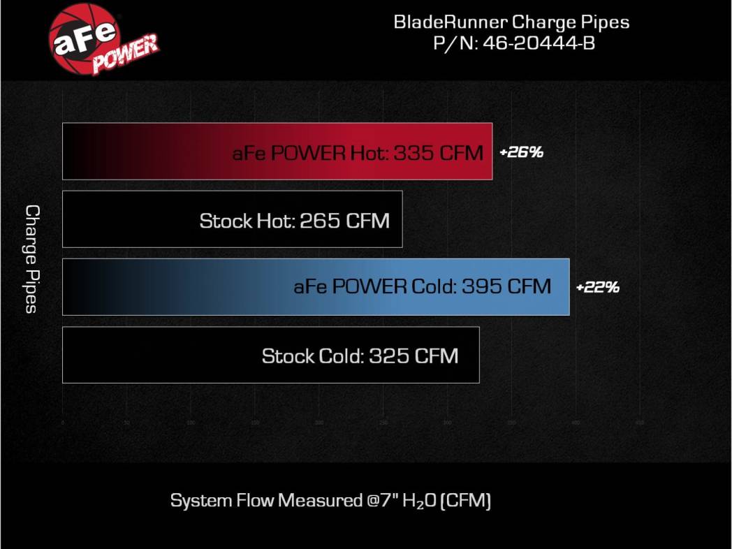 - Directly replace your Duramax’s restrictive plastic charge pipes with aFe's BladeRunner free-flowing, heat-resistant aluminum tubes.