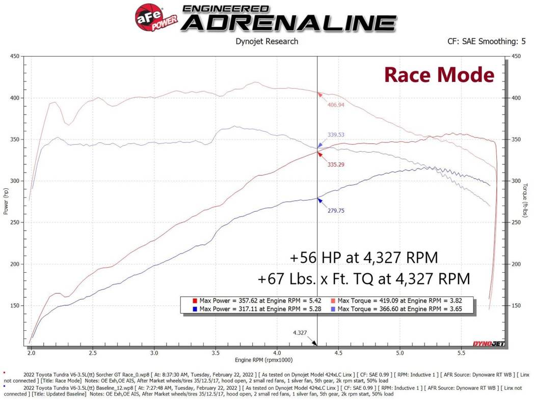 - Dyno tested and produced power increases of +56 HP and +67 lbs. x ft. Torque in race mode at 4,327 RPM on a 2022 Toyota Tundra V6-3.5L(tt) (same engine as the 2022 Land Cruiser)