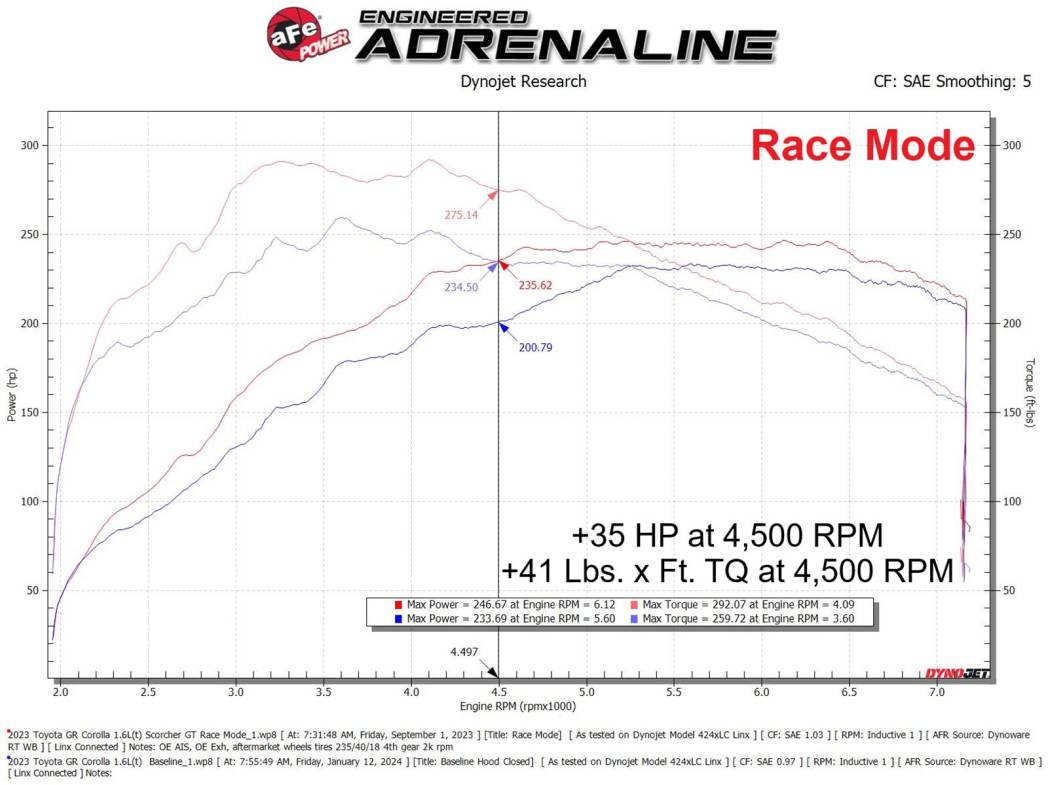 - Dyno tested and produced power increases of +35 HP and +41 lbs. x ft. Torque in Race Mode