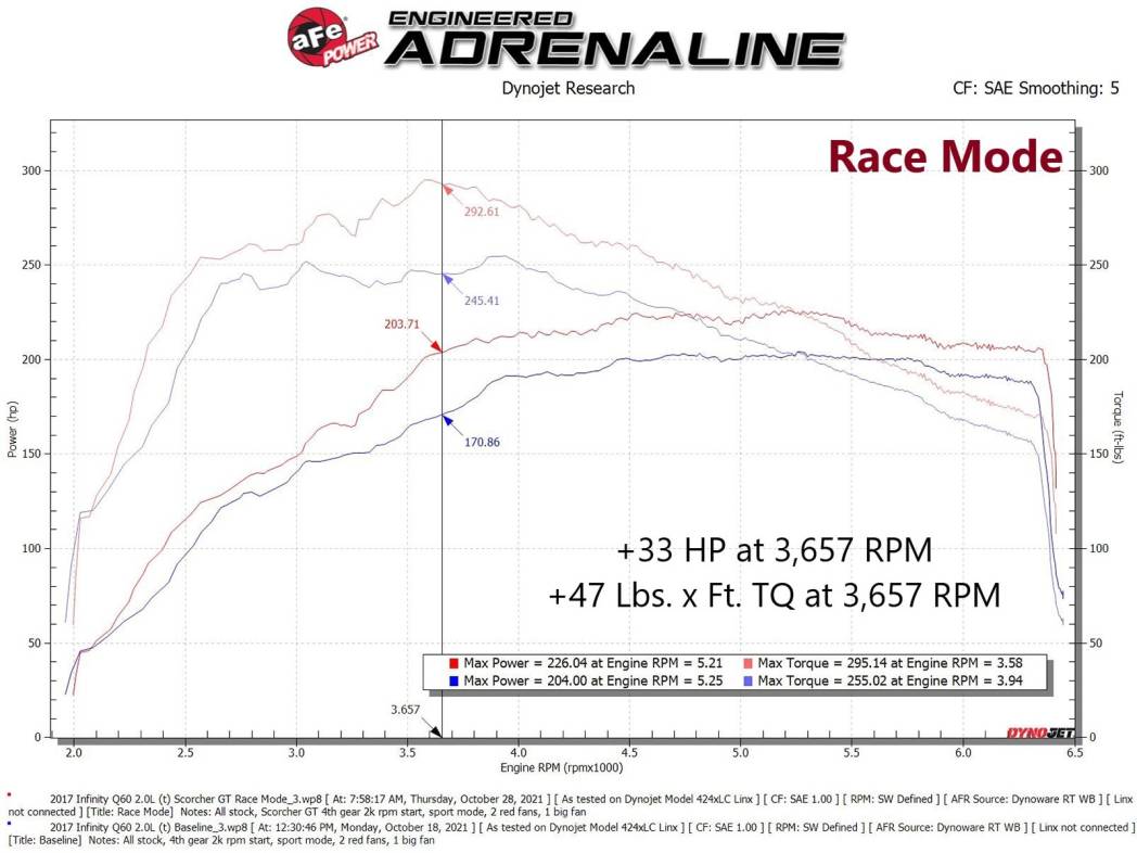 - Dyno tested and produced significant power increases of +33 HP / +47 lbs. x ft. torque in race mode at 3,657 RPM