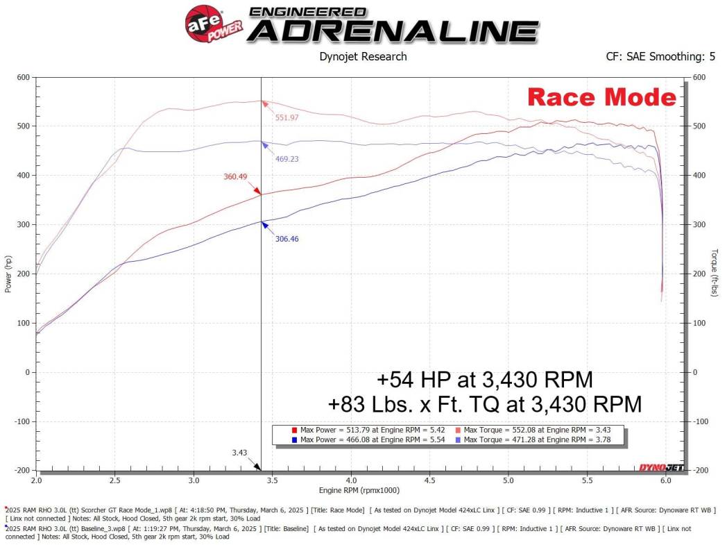- Dyno tested and produced power increases of +54 HP and +83 lbs. x ft. of Torque in race mode at 3,263 RPM