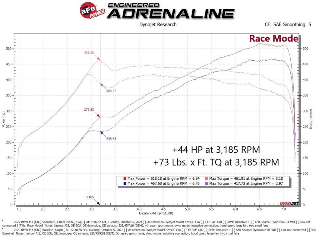 - Dyno tested and produced significant power increases of +44 HP / +73 lbs. x ft. torque in race mode at 3,185 RPM