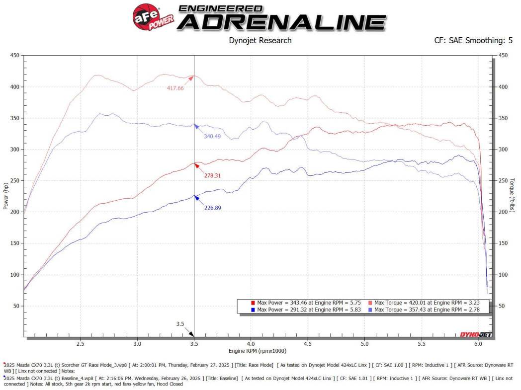 - Dyno tested and produced significant power increases of +51 HP / +77 lbs. x ft torque on a 2025 Mazda CX-70 in race mode