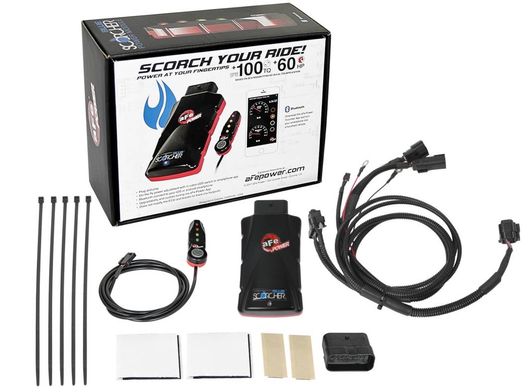 The aFe POWER SCORCHER BLUE Power module is the next generation of Plug and Play electronic module technology. It is the fastest way to safely gain significant horsepower, torque and improve drivability without modifying or leaving any trace on the Engine Control Unit (ECU). The SCORCHER BLUE features an LED control switch for in-cabin, on-the-fly power adjustments with different preset modes. With Bluetooth connectivity you can tap into your iOS or android device to make power adjustments, custom tune different power modes, view gauges for engine parameters, upgrade to the latest revision, measure acceleration times and more. The app is downloadable for free on the APP Store or Google Play store.