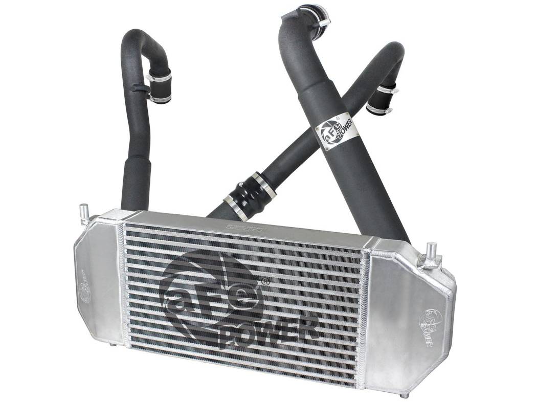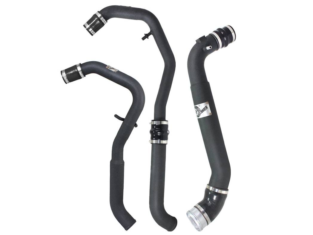 aFe POWER's hot side tubes are constructed from 2 and 2-1/2" mandrel-bent aluminum tubing and the cold side tube is constructed from 3-1/2" and 3 mandrel-bent aluminum tubing for maximum flow then, powder-coated for a nice finish. Smooth transition bends decrease turbulence and minimize pressure loss, while increasing horsepower and torque. Together this kit outflows the factory intercooler and tube set up.