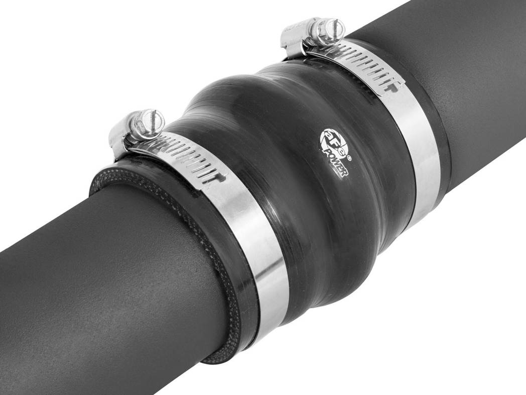 Constructed of 2-1/2" to 2-3/4" mandrel-bent aluminum tubing and powder-coated wrinkle-black for heat and corrosion resistance. The smooth transition mandrel bends decrease turbulence which increases horsepower and torque. The high-temp wrinkle-black powder-coating insulates the tube from engine heat and protects the tube from corrosion. Includes stainless steel clamps for a leak-free seal and heavy-duty 5-Ply reinforced silicone coupling for strength.