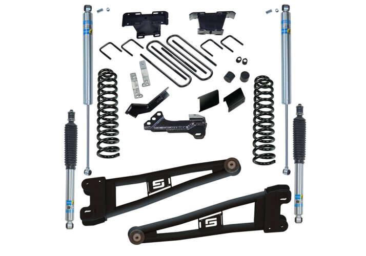 This 4” Radius Arm Lift for the 2023-24 Ford Super Duty F-250 and F-350 4WD is achieved via engine specific coil springs to ensure the proper lift height and maintain factory ride quality. Heavy duty radius arms are used to restore proper caster angle/alignment. Other Components included with the 4” system is: front compression travel-stop relocation brackets, track bar relocation bracket, and a steering stabilizer bracket. The rear lift is achieved with an HD fabricated rear block that allows the removal of the stock block. This fabricated block also allows for proper pinion and axle angle all while reducing axle wrap. Complete your 4-inch Ford F-250 | F-350 with the best variety of shocks on the market. Shocks for this kit are Bilstein Shocks