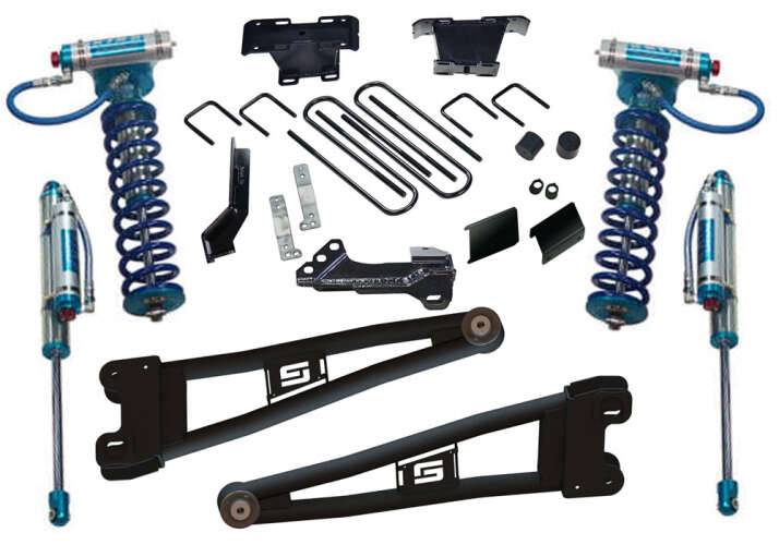This 4” Radius Arm Lift for the 2023-24 Ford Super Duty F-250 and F-350 4WD is achieved via engine specific coil springs to ensure the proper lift height and maintain factory ride quality. Heavy duty radius arms are used to restore proper caster angle/alignment. Other Components included with the 4” system is: front compression travel-stop relocation brackets, track bar relocation bracket, and a steering stabilizer bracket. The rear lift is achieved with an HD fabricated rear block that allows the removal of the stock block. This fabricated block also allows for proper pinion and axle angle all while reducing axle wrap. Complete your 4-inch Ford F-250 | F-350 with the best variety of shocks on the market. Shocks for this kit are King Coilovers and Rear Reservoir Shocks