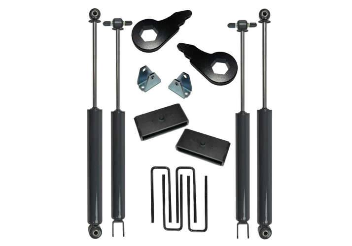 This 2” Silverado or Sierra 2500/3500 kit provides a moderate lift kit for the front suspension, a rear block & U-bolt kit plus front and rear shock absorbers. Priced much less than traditional taller lifts, this is the simple solution for those wanting an economical & easy way to make room for taller tires for ground clearance or a plus-size the tire & wheel package on the vehicle.