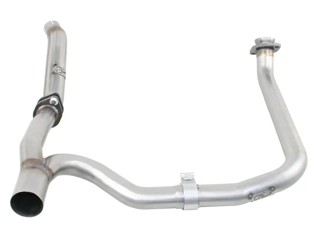 The aFe Scorpion Loop Delete/Y-Pipe combo package is engineered to replace the stock loop section and y-pipe to accommodate long arm travel lift kits that interfere with the OE loop and Y-Pipe. This product is constructed of mandrel bent, 2" to 2-1/2" aluminized steel tubing for maximum flow and comes with all necessary hardware. Cutting is required.