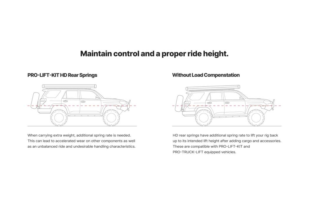 Note: Listed front lift heights range from 0lbs(1st height listed) to 250lbs(2nd height listed). Only recommended to run at heights of 150-250lbs, other heights listed for reference only. Too much lift will cause poor ride quality. Front Spring Only Recommended to pair with Eibach Pro-Truck Reservoir Shocks. Damage could occur to factory drive shaft with change in ride height. Consult instruction manual for proper installation.