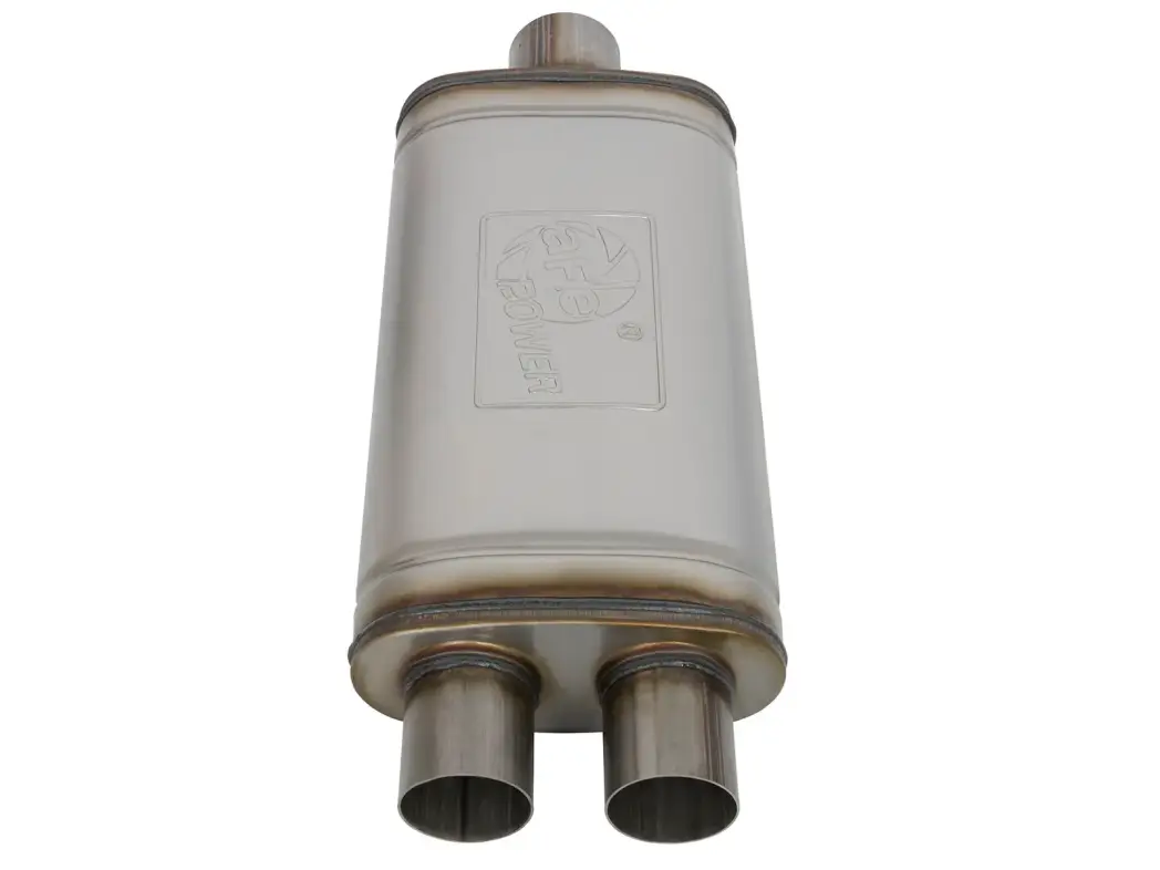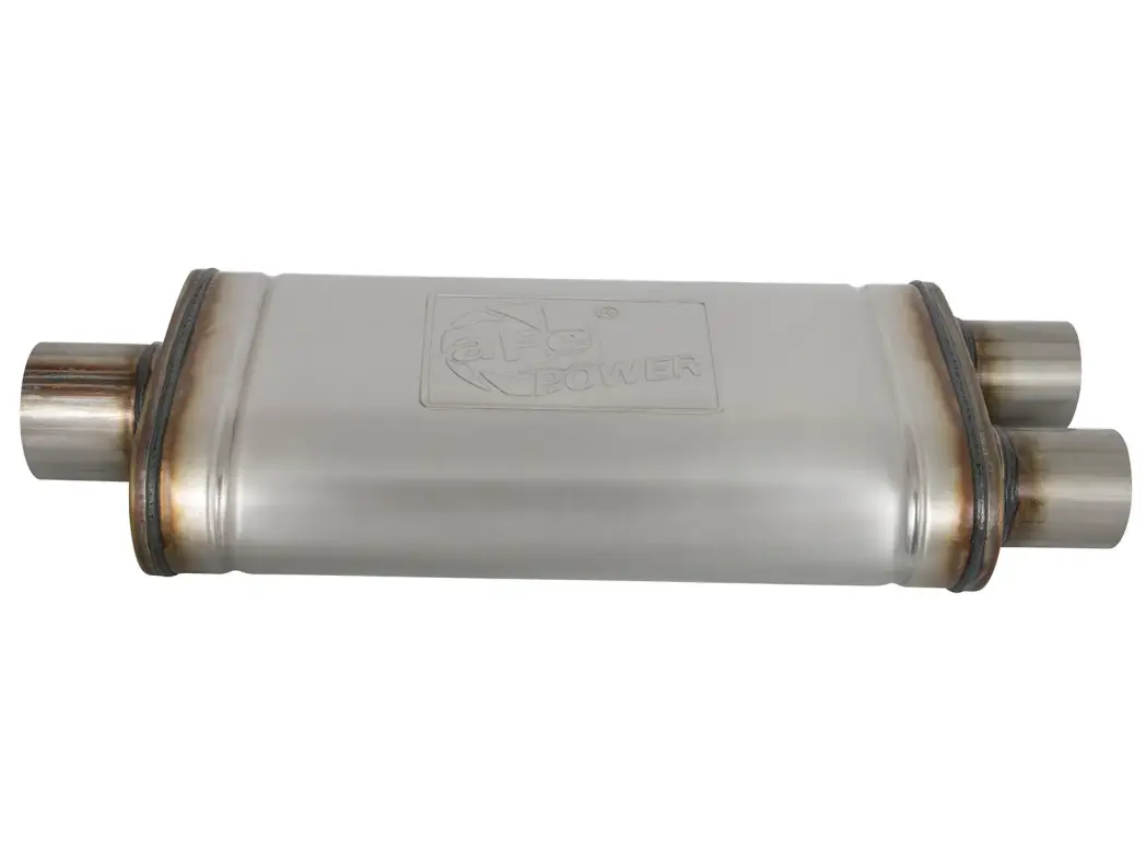 The aFe Universal fit 409 Stainless Steel Performance Muffler is designed to provide a deep, throaty, powerful sound on acceleration but maintain a smooth sound at idle. This muffler is constructed of brushed finished 409 stainless steel and uses a straight through perforated core with heat resistant packing to reduce backpressure and maximize exhaust flow. You will see increased performance and improved throttle response over the factory exhaust. Also featuring a stamped aFe Power logo for an aggressive style.