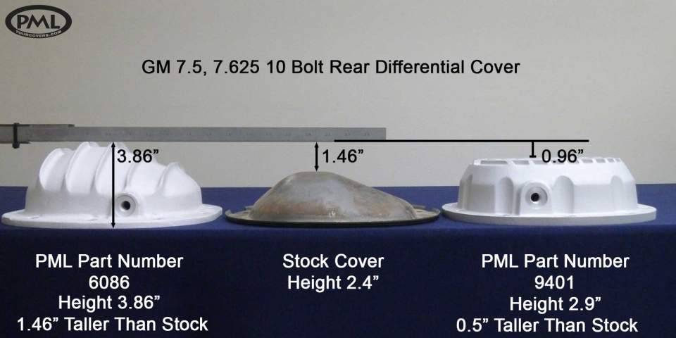 This PML diff cover fits the GM with 7.5 or 7.625 inch (7 1/2 or 7 5/8) ring gear 10 bolt differential. Configurations vary. Typical applications that may be able to use this cover include the following.