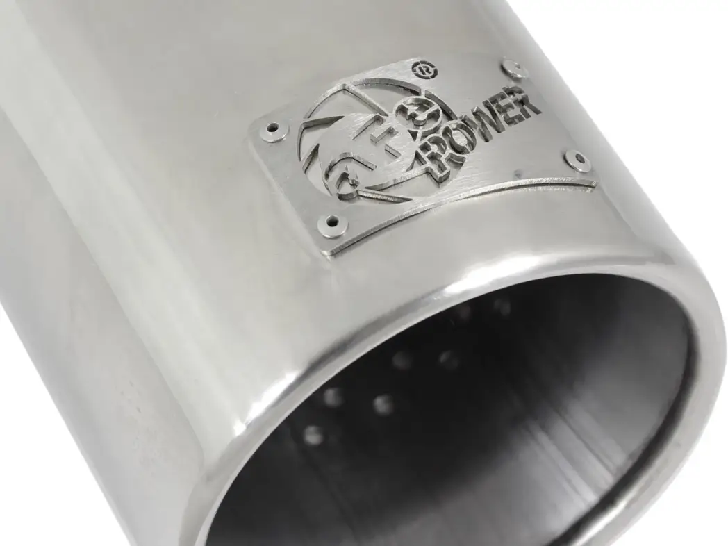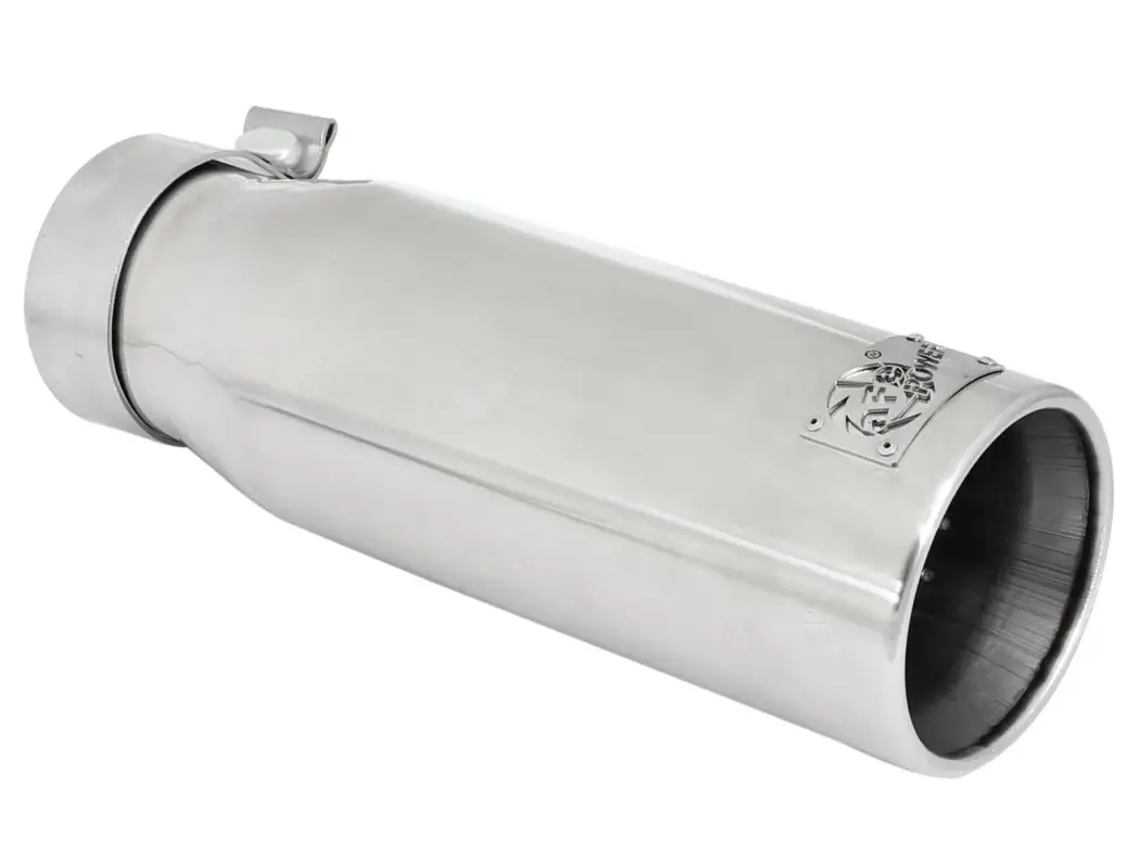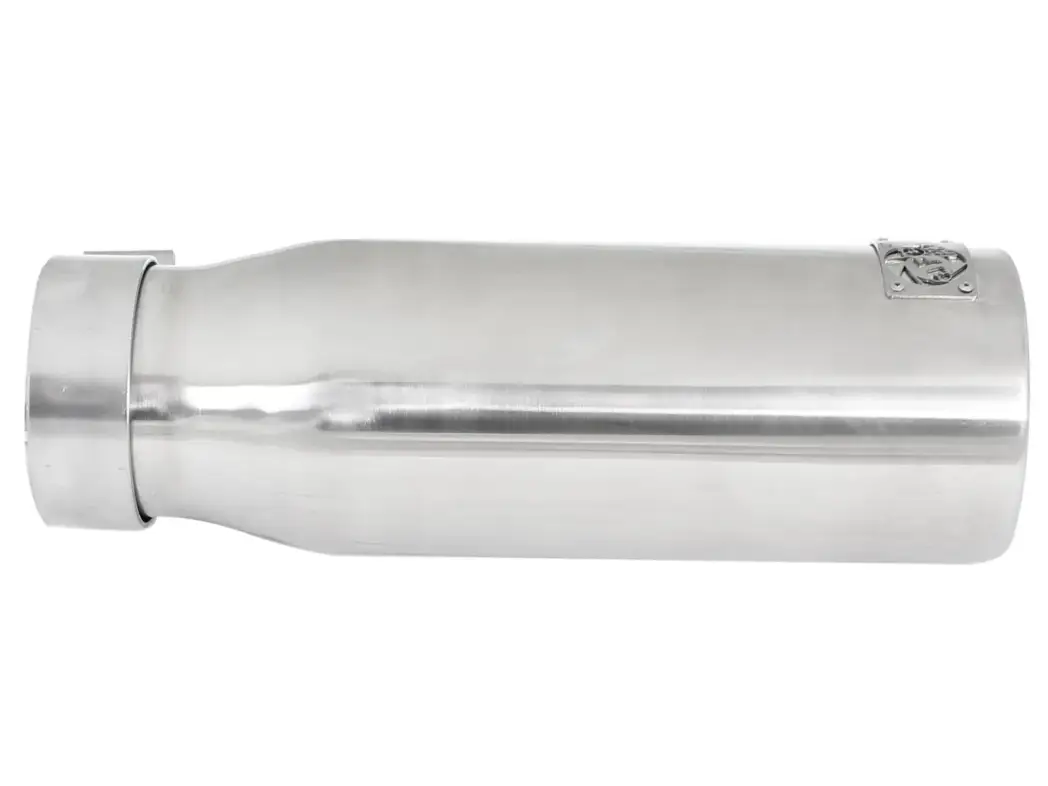 The aFe 304 stainless steel polished exhaust tip is designed to fit 3" exhaust systems. This high quality tip uses a 304 stainless steel band clamp to ensure a very secure grip. A riveted stainless steel laser-cut logo plate stands out against the black tip for an aggressive style. With a 3" inlet, 4" outlet and a massive 12" inch length, this double-walled, rolled edge resonated tip is a nice compliment for any 3" exhaust system