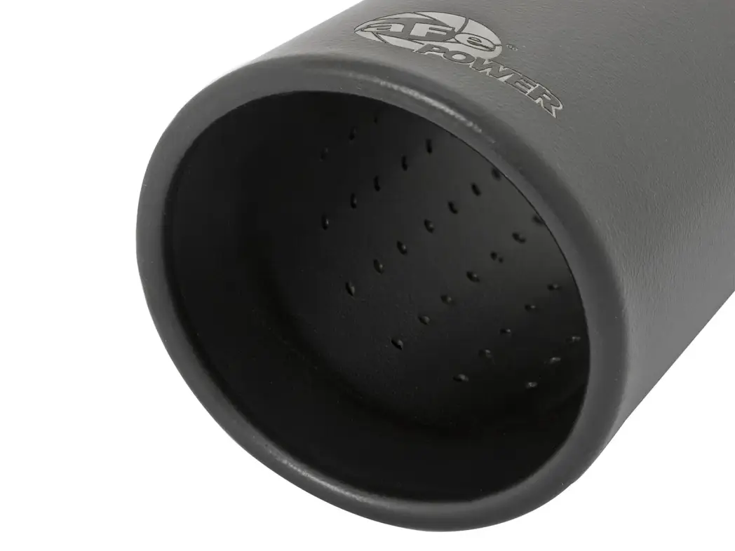 aFe POWER is proud to introduce an all new exhaust tip. This tip comes with a powder-coated black finish and is designed to fit 3" exhaust systems. With a 3" inlet x 4" outlet and 12" inch length, this dual-walled, angle cut rolled tip comes with a unique laser-etched aFe POWER logo for an aggressive style.