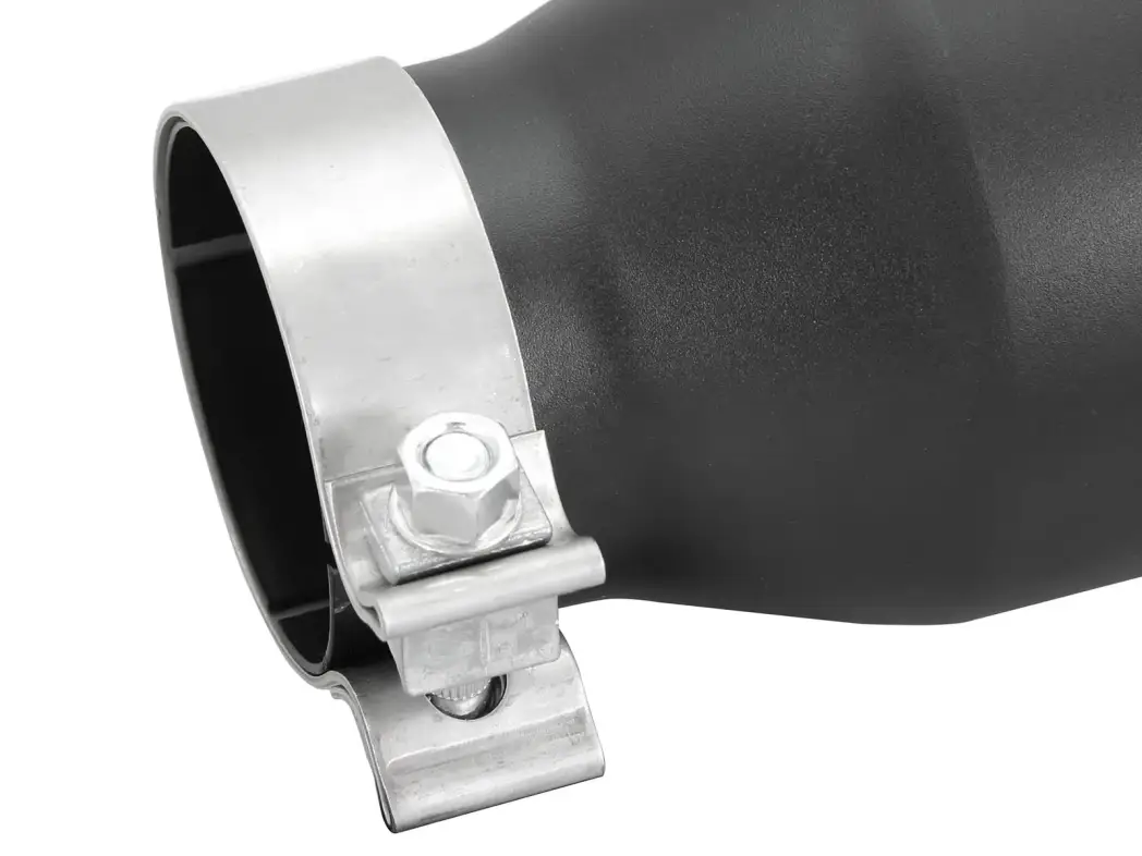 aFe Power is proud to introduce the all new exhaust tip. This tip comes with a matte black finish and is designed to fit 3" exhaust systems. With a 3" inlet x 4-1/2" outlet and 9" inch length, this single-walled, angle cut rolled tip comes with a unique laser-cut aFe Power logo plate riveted on for an aggressive style