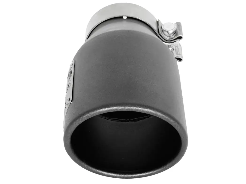 - Upgrade your exhaust tip with a Mach Force Xp 409 stainless steel, universal tip designed to fit most 3" exhaust systems. This 9” long, double-walled, slash cut exhaust tip is finished with a high-temperature, metallic black powder coating for corrosion resistance and a custom look. A unique laser-cut aFe Power logo plate is riveted on for brand quality authenticity and has a drain port built in for convenience. Completely adjustable, the tip includes a high quality stainless steel band clamp so there’s no modification or welding required.