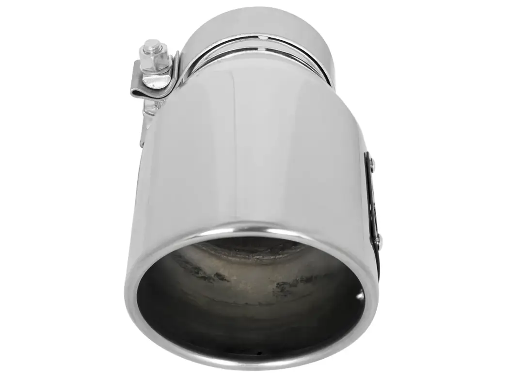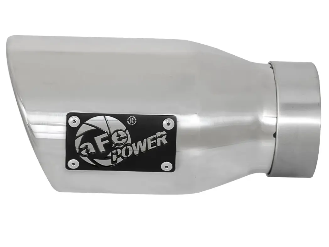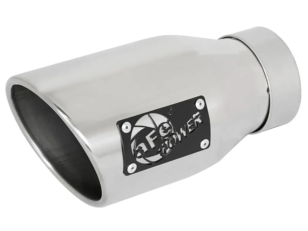 aFe Power is proud to introduce the all new exhaust tip. This tip comes with a mirror polished finish and is designed to fit 3" exhaust systems. With a 3" inlet x 4-1/2" outlet and 9" inch length, this single-walled, angle cut rolled tip comes with a unique laser-cut aFe Power logo plate riveted on for an aggressive style.