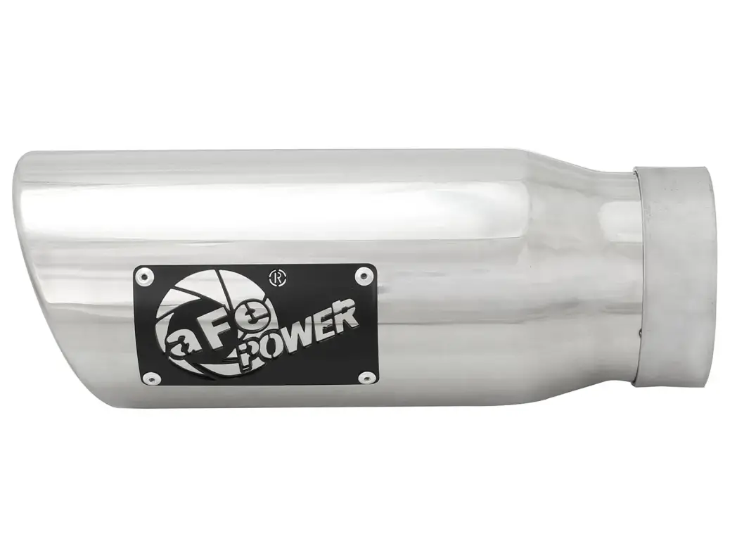 aFe Power is proud to introduce the all new exhaust tips. These tips come as set and have a mirror polished finish. The tips are designed to fit 3-1/2" dual exhaust systems. With a 3-1/2" inlet x 4-1/2" outlet and 12" inch length, these single-walled, angle cut rolled tips comes with unique laser-cut aFe Power logo plates riveted on for an aggressive style.