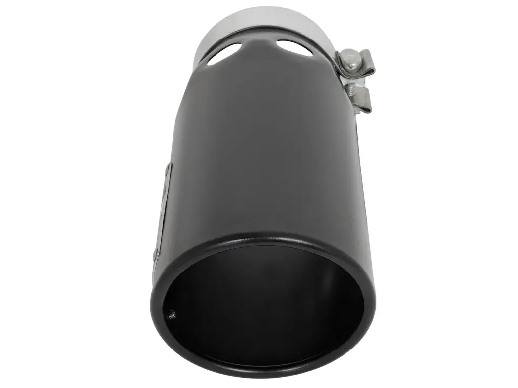 aFe POWER is proud to introduce an all new intercooled exhaust tip. This tip comes with a black finish and is designed to fit 4" exhaust systems. With a 4" inlet x 5" outlet and 12" inch length, this single-walled, angle cut rolled tip comes with intercooling vents and a unique laser-cut aFe POWER logo plate riveted on for an aggressive style.